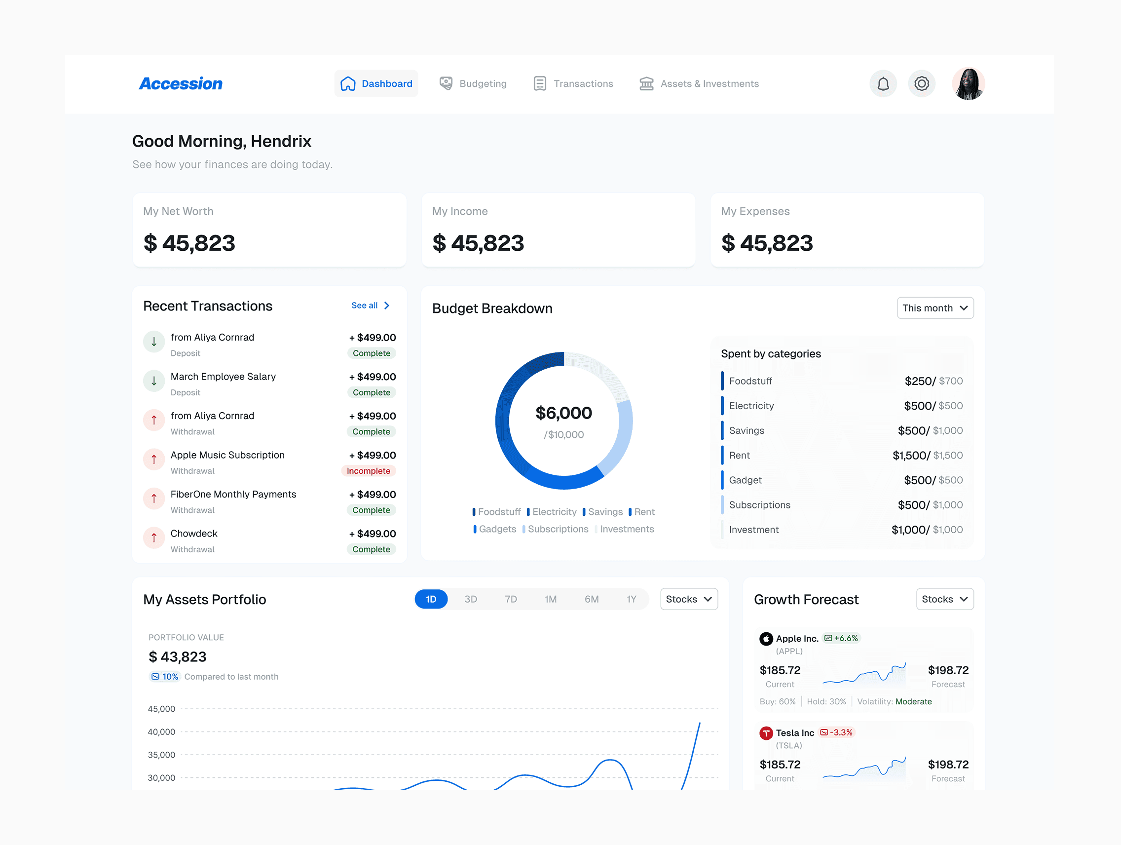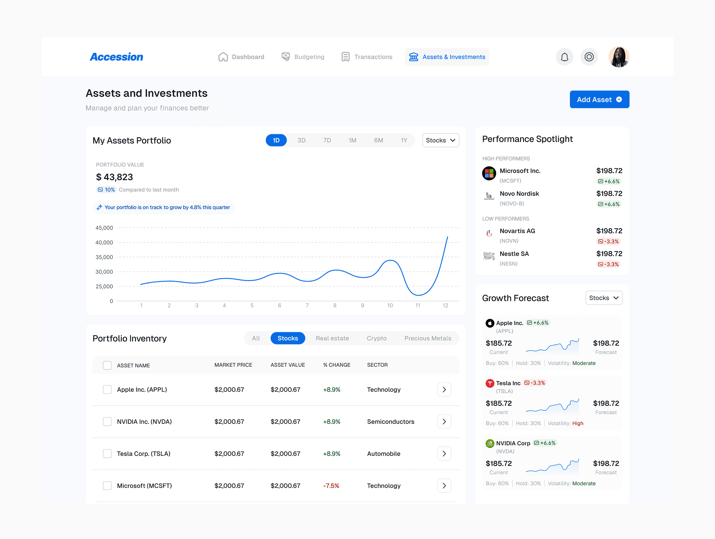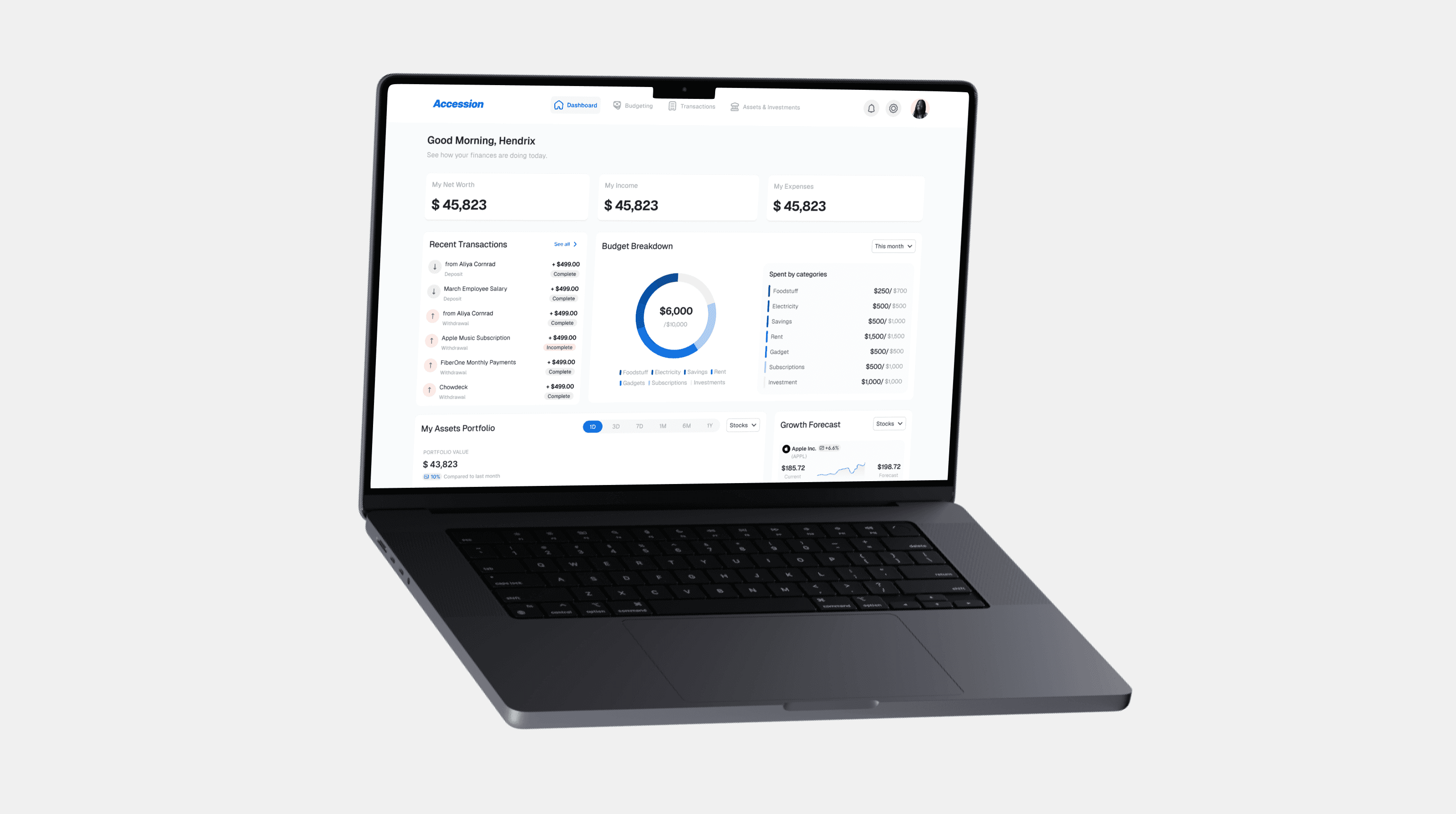 Accession is a web-based financial platform built to help users understand their money, plan better, and track long-term wealth growth. It supports everyday budgeting while offering investment and asset-tracking features usually found in advanced wealth tools. I led the full UX for the web platform, focusing on clarity, accuracy, and long-term financial confidence.