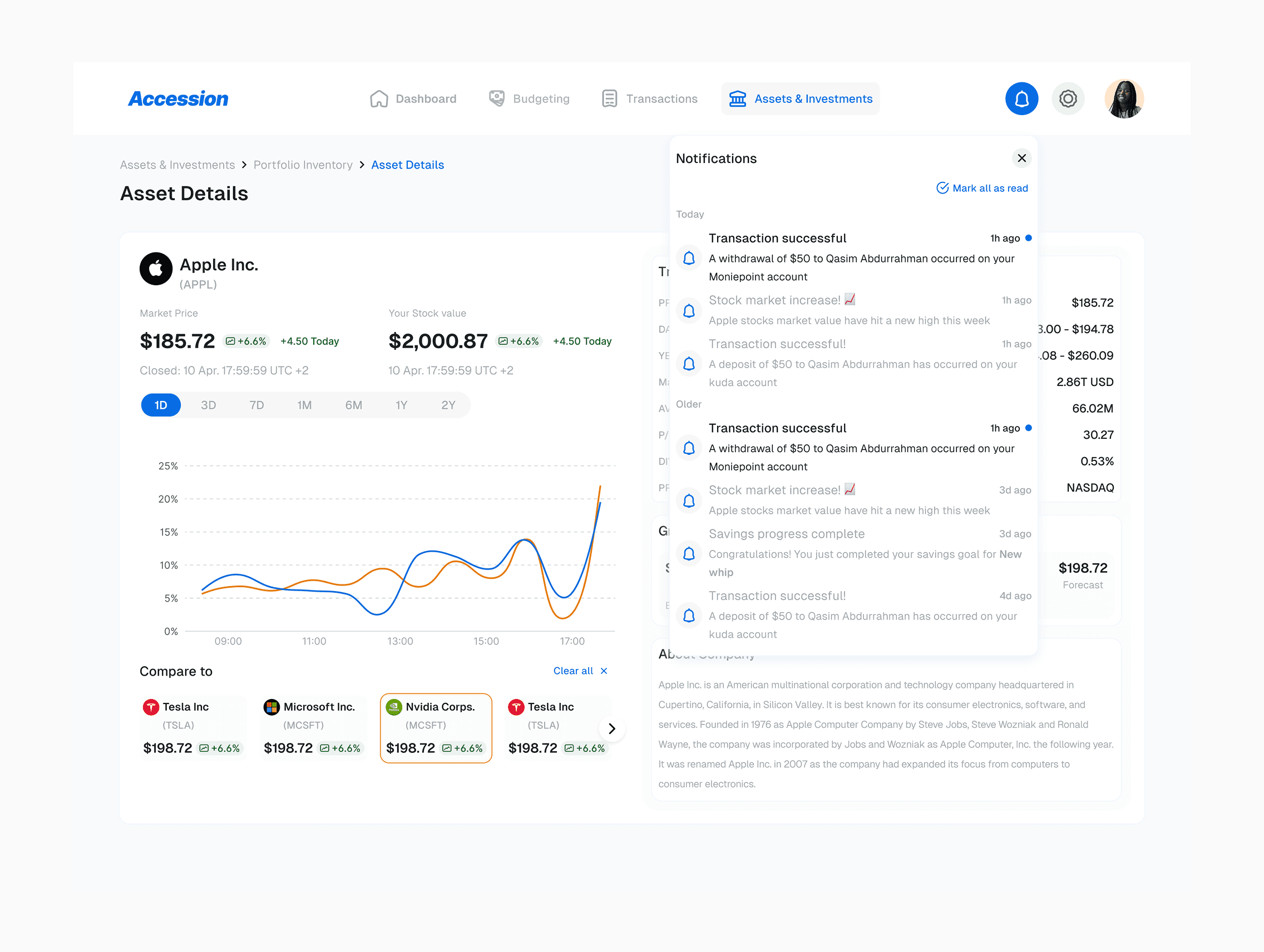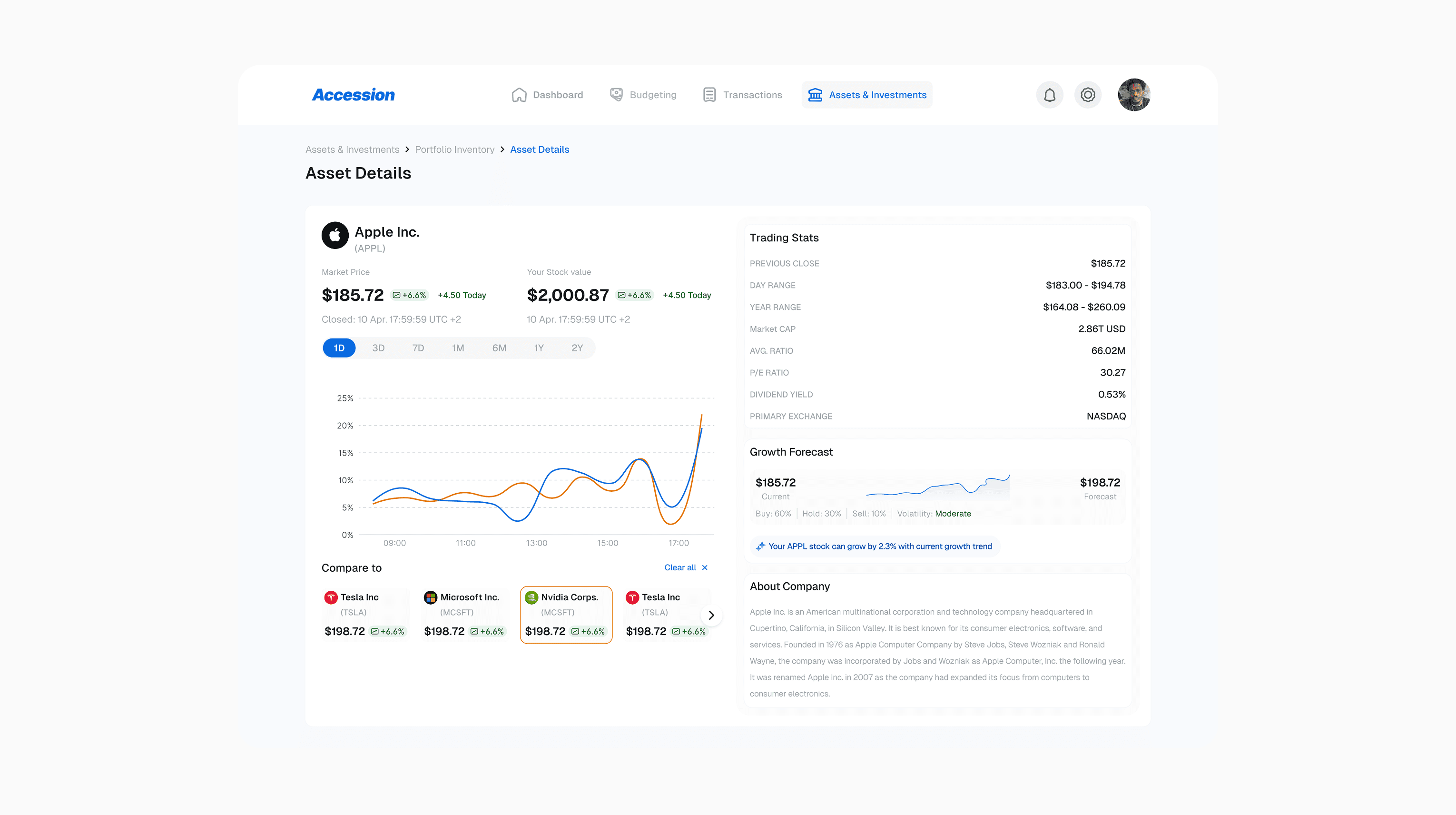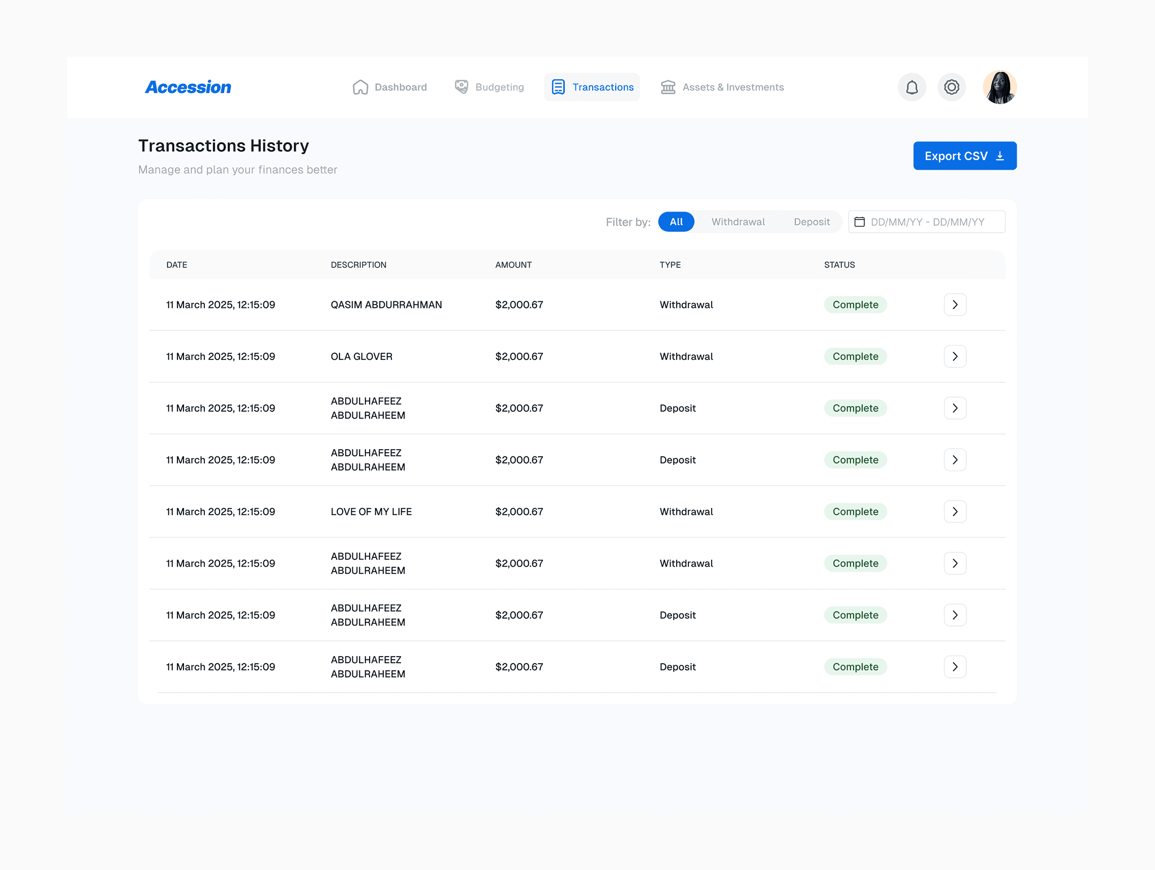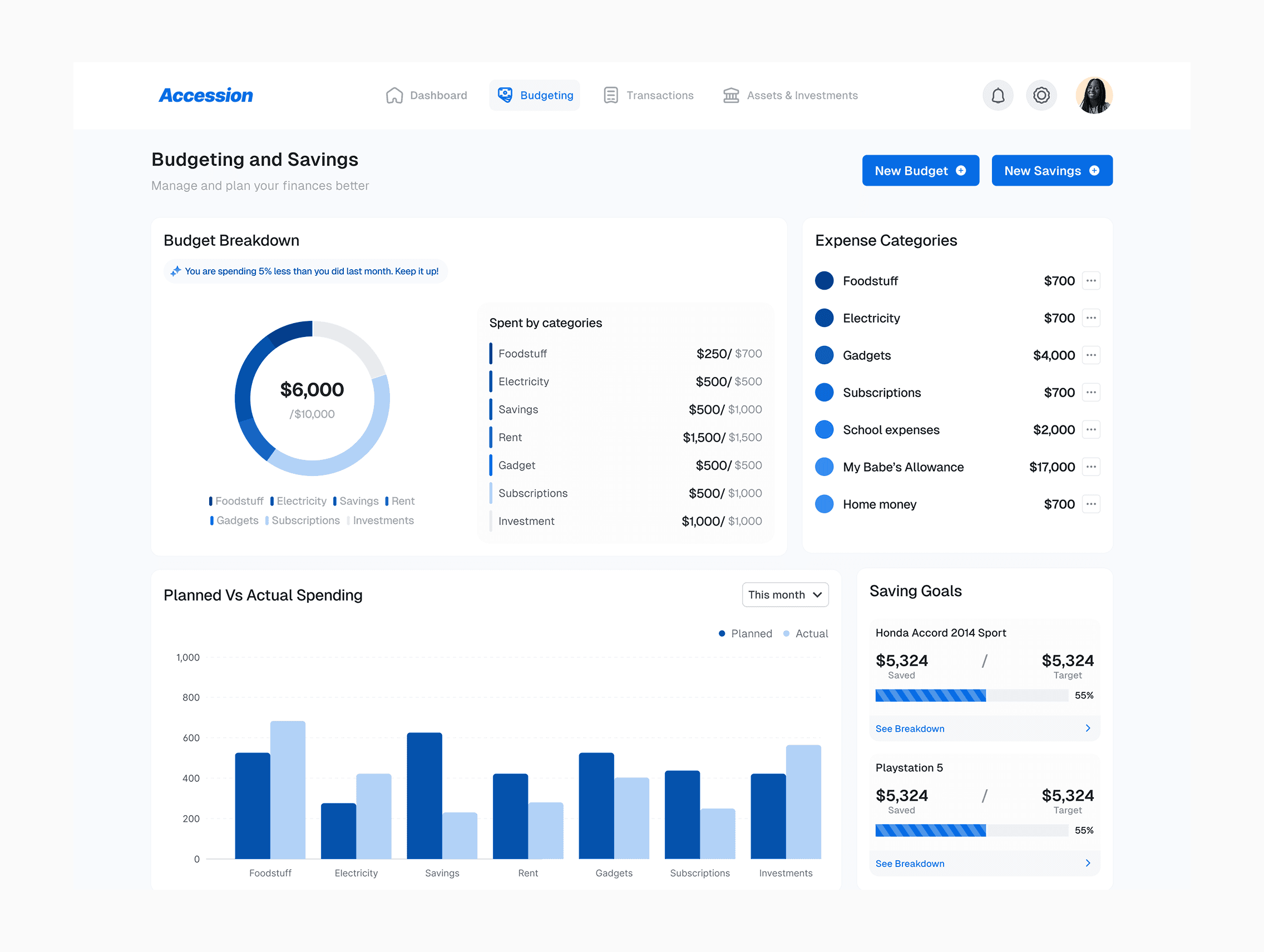 Accession is a web-based financial platform built to help users understand their money, plan better, and track long-term wealth growth. It supports everyday budgeting while offering investment and asset-tracking features usually found in advanced wealth tools. I led the full UX for the web platform, focusing on clarity, accuracy, and long-term financial confidence.